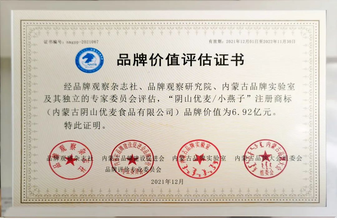 大會還發(fā)布了2021年度“內(nèi)蒙古百強品牌價值評估報告”,經(jīng)權(quán)威機構(gòu)及專家委員會評估,陰山優(yōu)麥品牌價值為6.92億元。