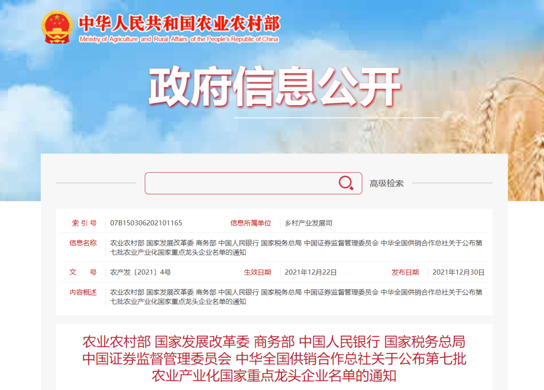 根據《農業農村部辦公廳關于開展第七批農業產業化國家重點龍頭企業申報工作的通知》(農辦產〔2021〕5號)要求和《農業產業化國家重點龍頭企業認定和運行監測管理辦法》(農經發〔2018〕1號)規定,農業農村部會同國家發展改革委、商務部、中國人民銀行、國家稅務總局、中國證券監督管理委員會、中華全國供銷合作總社,組織開展了第七批農業產業化國家重點龍頭企業認定工作。經各省(區、市)遴選推薦、農業農村部組織專家評審、全國農業產業化聯席會議審議、公示,決定認定北京臻味坊食品有限公司等412家企業為農業產業化國家重點龍頭企業,有效期到2024年監測結果公布前。
